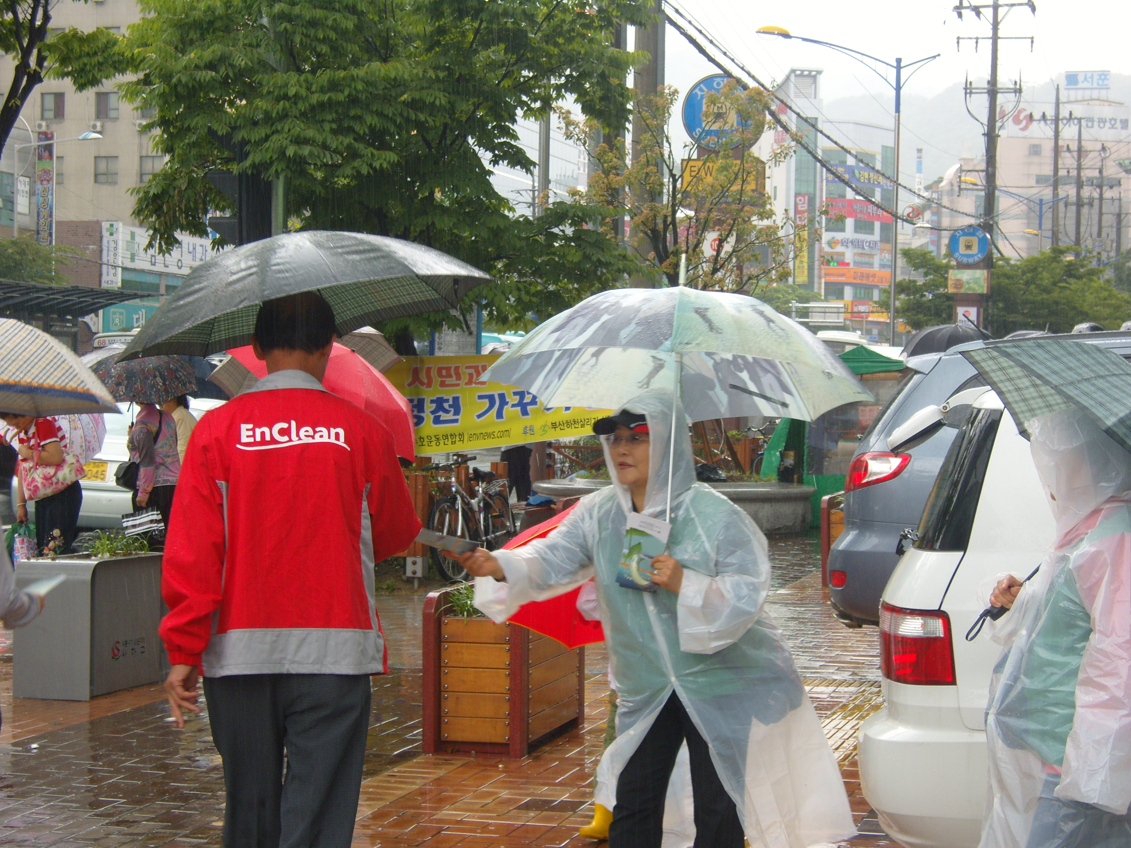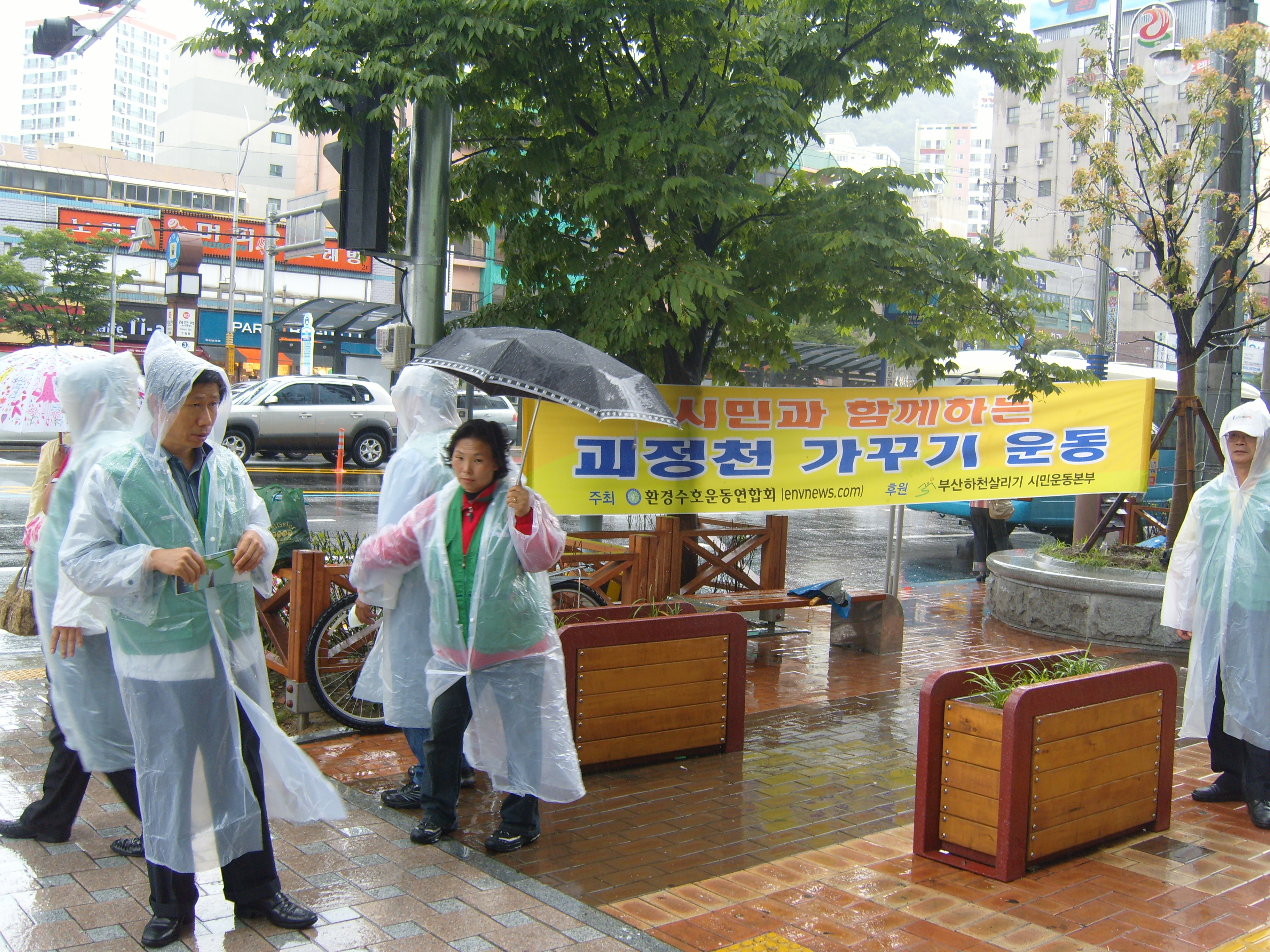 괴정천가꾸기에 동참해 줄것을 외쳤다.참가한 회원 들은 내리는 비를 맞아가며 심한